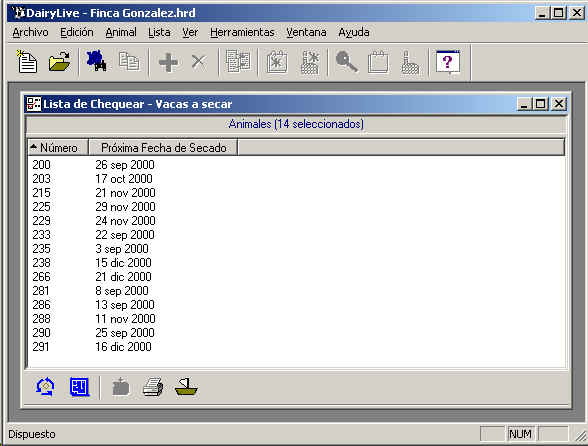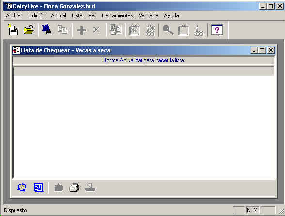 Debajo del menu, hay una barra de herramientas que contiene Iconos que le permiten accesar directamente a algunas de las funciones mas usadas en DairyLive. Esta barra de herramientas permanecera siempre igual, sin embargo ciertos Iconos se desactivaran dependiendo de lo que se tenga en pantalla en determinado momento.