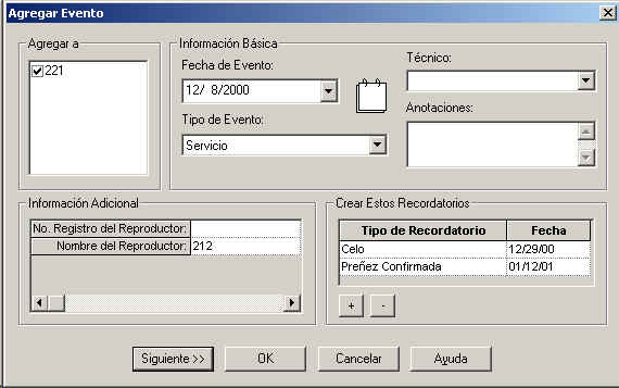 Bajo Informacion Adicional, se le solicitara ya sea No. del Registro o el Nombre del Reproductor, seleccionelo y presione el boton de OK, y el evento sera agregado a este animal, asi como los recordatorios de Celo para despues de 21 dias y de Preñez Confirmada para despues de 35 dias.