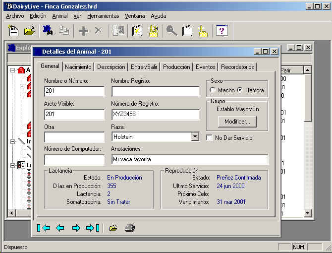El Explorador del Hato muestra unicamente cierta informacion del animal. Para ver toda la informacion del animal, seleccione el animal que desea ver, y vaya al menu Objeto->Abrir, o presione el boton que se asemeja a una lupa y que se encuentra en la barra de herramientas principal.