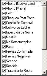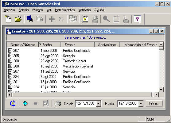 Para ver los eventos que han sido registrados para un determinado animal o grupo de animales, seleccionelos del Explorador del Hato, y vaya al menu Objeto->Animal->Eventos, o presione el Icono que se asemeja a un calendario en la barra de herramientas principal.