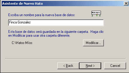 Escriba el nombre que le dara al Hato, puede ser el nombre de su Hacienda o Finca, este sera el nombre del archivo que contiene la informacion del hato. La pantalla le indicara la carpeta en la cual se guardara el archivo, si desea cambiar la carpeta, presione el boton Modificar.., y seleccione la carpeta.