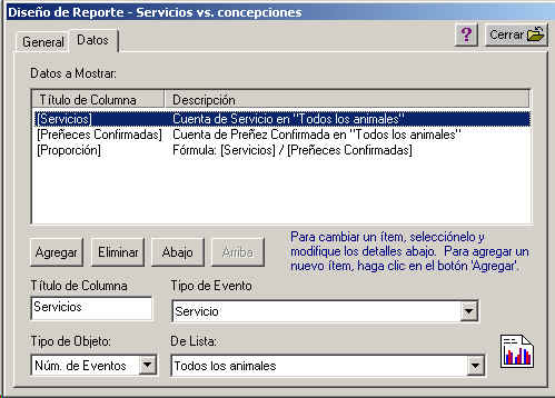 La viñeta Datos le permite seleccionar la informacion que se mostrara en el reporte :