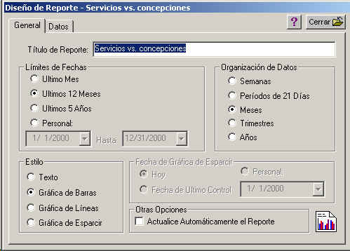 Ahora presione el boton Diseñar, a continuacion se le mostrara una pantalla a traves de la cual podra modificar el Reporte. La pantalla Diseño de Reporte tiene dos viñetas, la viñeta denominada General, le permite especificar un nombre para el reporte, asi como el rango de fechas a considerar, intervalo de tiempo y el tipo de reporte. (Los graficos de esparcir son un tipo especial de grafico. Para mayor informacion Reportes ).